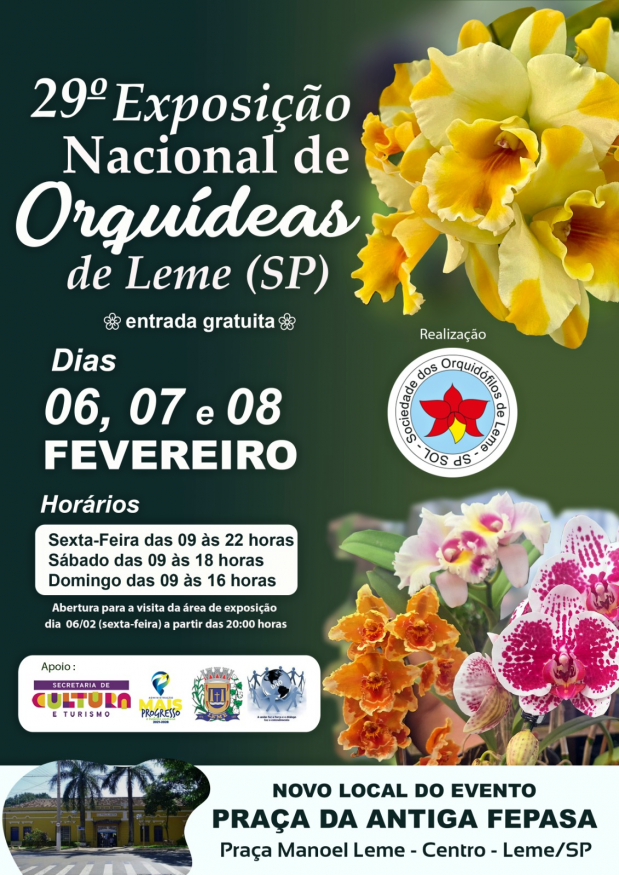 Confirmado pela Sociedade dos Orquidófilos de Leme, a tradicional Exposição Nacional de Orquídeas de Leme, acontecerá entre os dias 06 e 08 de fevereiro.
