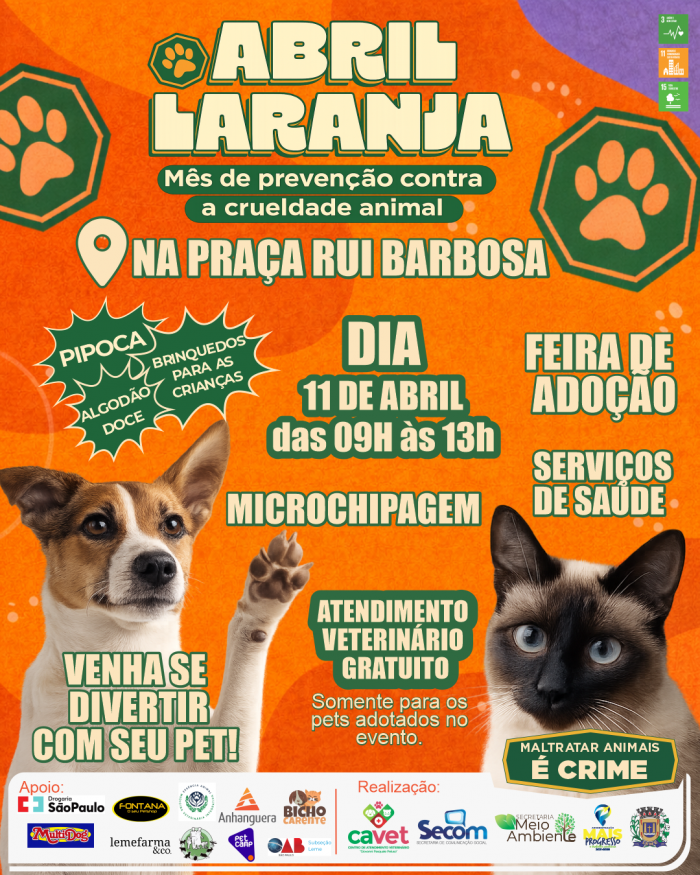 A Prefeitura de Leme, por meio da Secretaria Municipal do Meio Ambiente e do CAVET – Centro de Atendimento Médico Veterinário, promove ao longo do mês a campanha Abril Laranja, voltada à conscientização e ao combate aos maus-tratos contra animais.