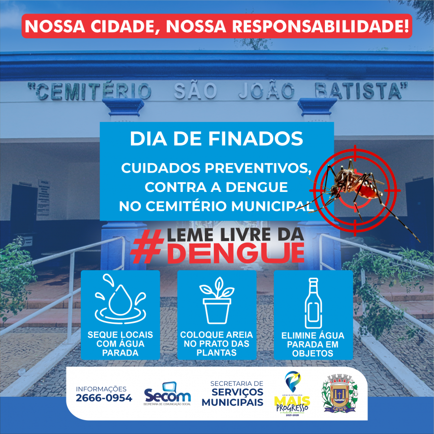 A Prefeitura do Município de Leme, por meio da Secretaria de Serviços Municipais, informa sobre o funcionamento e a programação religiosa no Cemitério Municipal São João Batista para as celebrações do Dia de Finados, no domingo, 2 de novembro. Além de orientar sobre o fluxo de visitantes, a administração municipal reforça os cuidados necessários para evitar a proliferação do mosquito Aedes aegypti, transmissor da dengue.