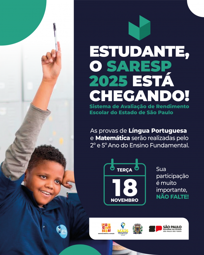 A Prefeitura do Município de Leme, por meio da Secretaria e Educação, informa aos Pais e Responsáveis que a aplicação da prova do SARESP - Sistema de Avaliação do Rendimento Escolar do Estado de São Paulo - 2025 ocorrerá no dia 18 de novembro, para os alunos matriculados nos 2º e 5º Anos do Ensino Fundamental da Rede Municipal de Ensino.