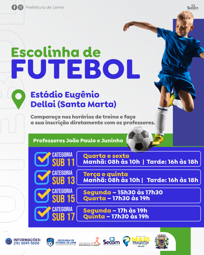 A Secretaria de Esportes e Lazer disponibiliza através do site www.competifacil-leme.com.br, todas as informações referentes as competições, como: tabela de jogos, resultados, classificação, artilharia e etc.