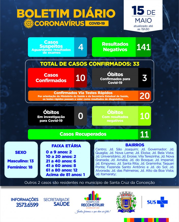 CONFIRMADOS: Ao todo, a Secretaria de Saúde confirmou 33 (trinta e três) casos, sendo 03 (três) óbitos por Covid-19. 10 (dez) casos confirmados através de exames PCR; e 20 (vinte) casos positivos confirmados via teste rápido e estão sendo monitorados pela Vigilância Epidemiológica.