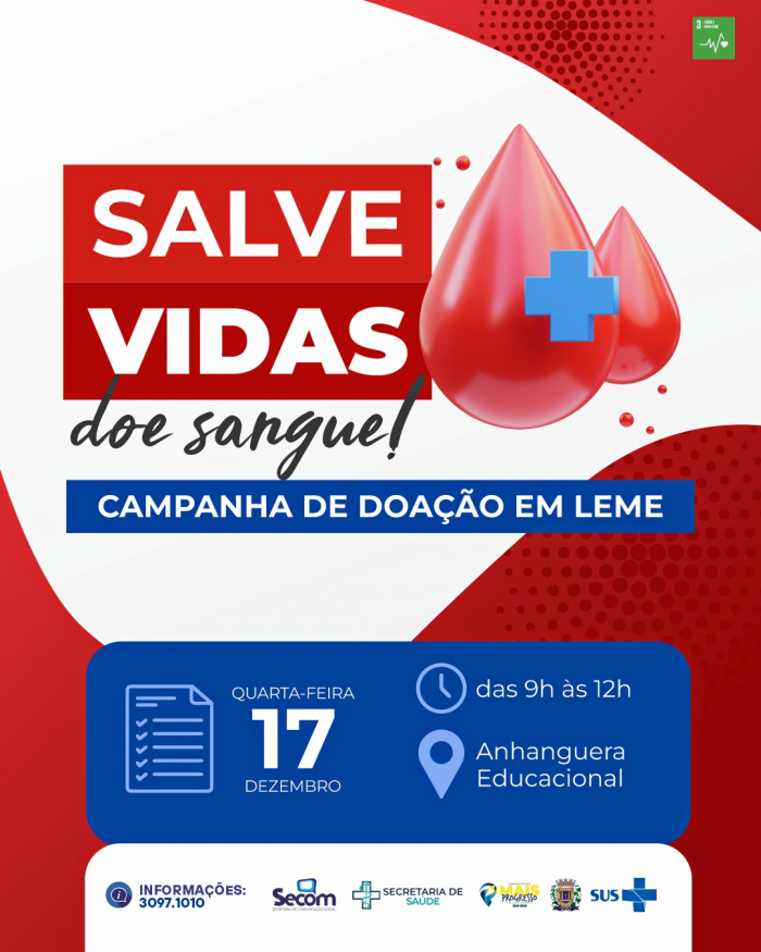 A Prefeitura do Município de Leme, por meio da Secretaria da Saúde e em parceria com a Unicamp, informa sobre a realização da última etapa do calendário de doação de sangue 2025, que será realizada na Faculdade Anhanguera no dia 17 de dezembro, das 09h às 12h.