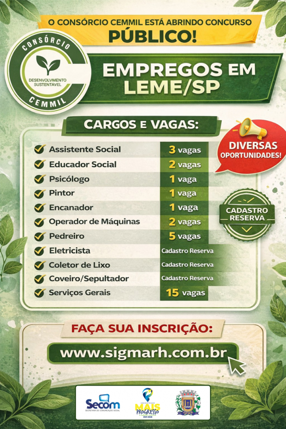 O Consórcio Intermunicipal CEMMIL para o Desenvolvimento Sustentável, através do seu Superintendente Sr. Ivair Luiz Biazotto, no uso de suas atribuições e prerrogativas legais, de acordo com o Art. 37, inciso II, da Constituição Federal de 1988, faz saber que fará realizar, através da empresa Sigma RH Recursos Humanos Ltda; as inscrições para o Processo Seletivo de Provas – PS Nº 03/2026 para contratação sob regime da Consolidação das Leis Trabalhistas - CLT, das vagas disponíveis para as Funções constantes do Quadro de Funções, em anexo:
