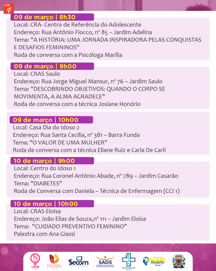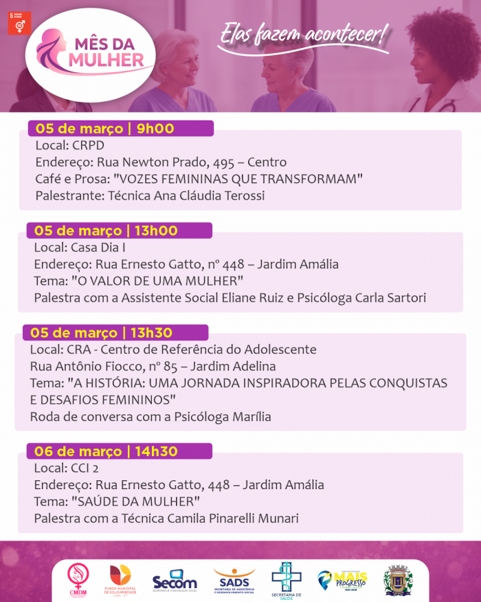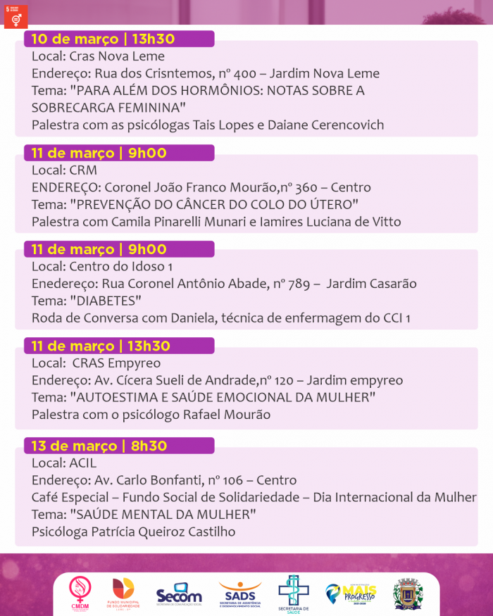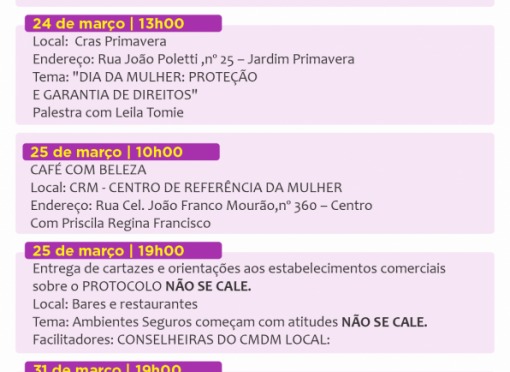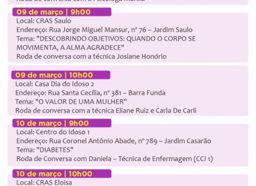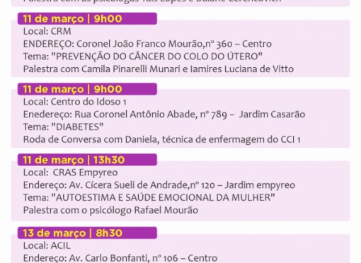 Durante todo o mês de março, diversos equipamentos públicos promoverão palestras, rodas de conversa, ações de conscientização e momentos de integração.