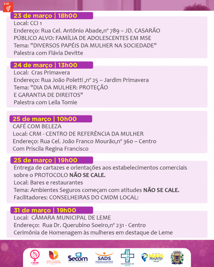 A Prefeitura do Município de Leme, por meio da Secretaria de Assistência e Desenvolvimento Social, apresenta a programação oficial do Mês da Mulher 2026, com atividades voltadas à valorização, saúde, protagonismo e garantia de direitos das mulheres.