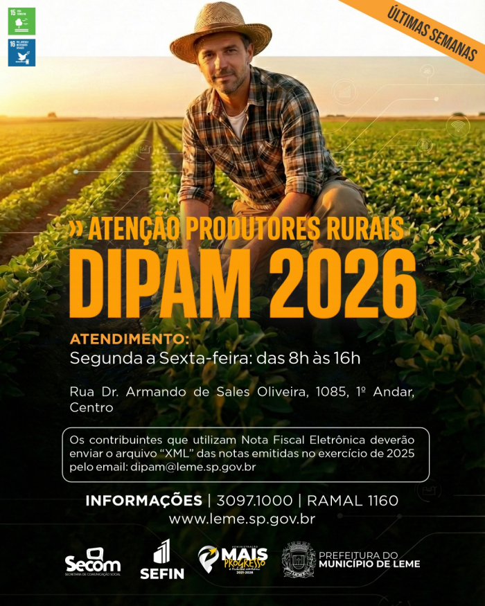 A Prefeitura do Município de Leme, por meio da Coordenadoria de Fiscalização de Tributos, informa que já estão sendo realizados os atendimentos aos produtores rurais do município referentes à Declaração para o Índice de Participação dos Municípios – DIPAM “A” 2026, relativa às operações de saída de produtos agropecuários ocorridas no ano-base 2025.