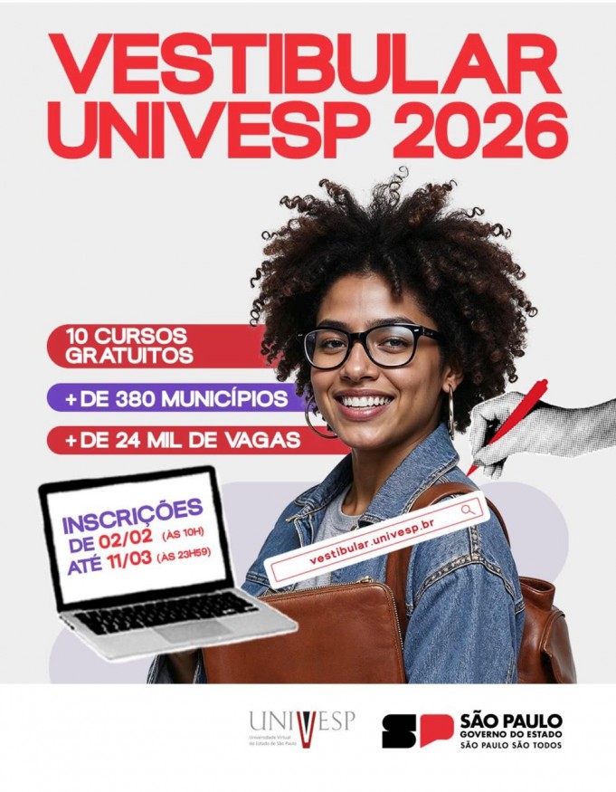 A Universidade Virtual do Estado de São Paulo (Univesp), vinculada à Secretaria de Ciência, Tecnologia e Inovação (SCTI), abriu nesta segunda (02/02), às 10h , as inscrições para 24.029 vagas do Vestibular anual 2026, projetadas para 456 polos , de 386 municípios (capital, interior e litoral). São oferecidos dez cursos gratuitos: Letras, Matemática e Pedagogia (Eixo de Licenciatura), Ciência de Dados, Engenharia de Computação, Tecnologia da Informação e o novo curso de Inteligência Artificial (Eixo de Computação), e Administração, Engenharia de Produção e Tecnologia em Processos Gerenciais (Eixo de Negócios e Produção). As inscrições terminam no dia 11/03, às 23h59 , e devem ser feitas pelo site: vestibular.univesp.br . A prova (objetiva e redação) ocorrerá no dia 26/04, às 13h , e os locais oficiais serão divulgados no dia 15/04, a partir das 10h . O início das aulas está previsto para o final de junho de 2026. Neste ano, a Univesp ofereceu ainda 2.956 vagas para o Provão Paulista.