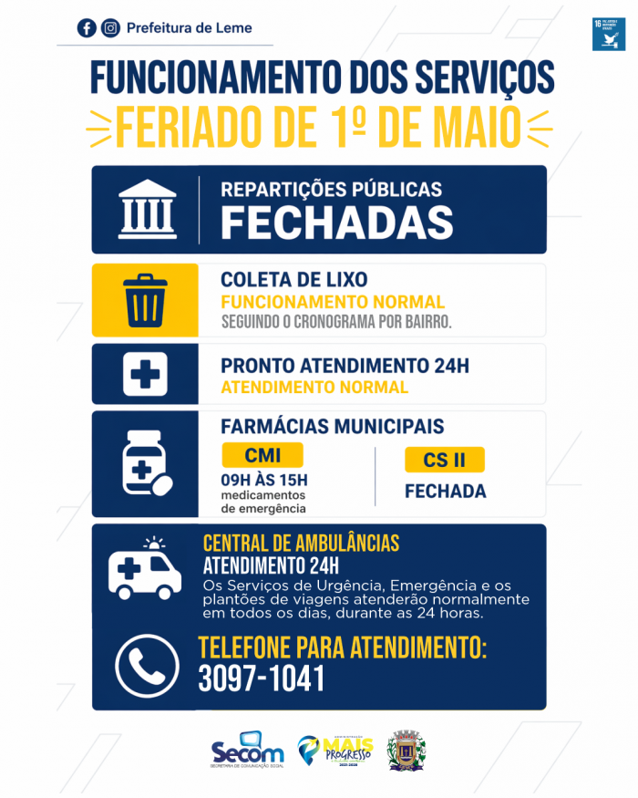 A Prefeitura do Município de Leme, por meio da Secretaria de Comunicação Social, informa sobre o feriado nacional de 1º de maio.