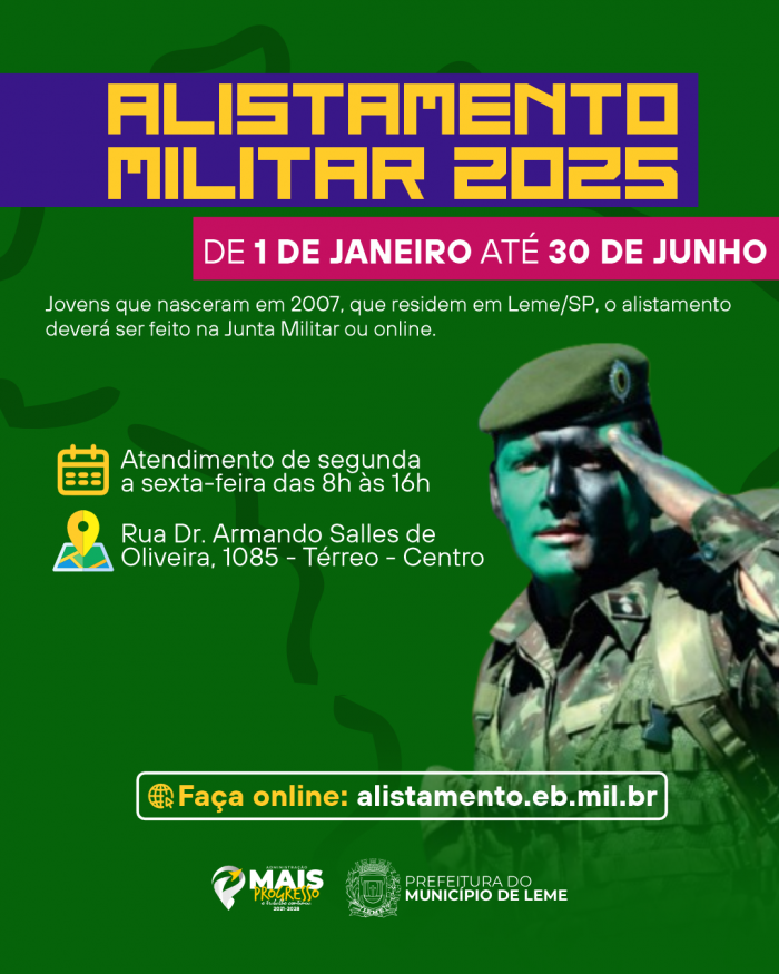 A Prefeitura do Município de Leme, por meio da Junta de Serviço Militar, informa sobre o Alistamento Militar – 2025, para jovens que nasceram no ano de 2007, independente do mês de nascimento, e que devem realizar o Alistamento Militar obrigatório a partir do próximo dia 1º de janeiro até o dia 30 de junho de 2025.