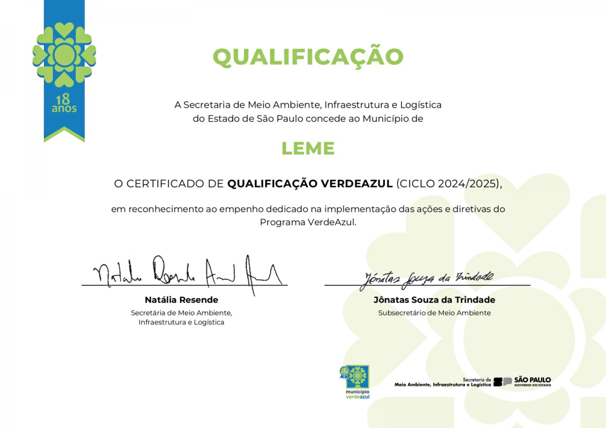 O município de Leme recebeu o Certificado de Qualificação do Programa Município VerdeAzul – Ciclo 2024/2025, concedido pela Secretaria de Meio Ambiente, Infraestrutura e Logística do Governo do Estado de São Paulo, em reconhecimento à eficiência da gestão ambiental desenvolvida no município.