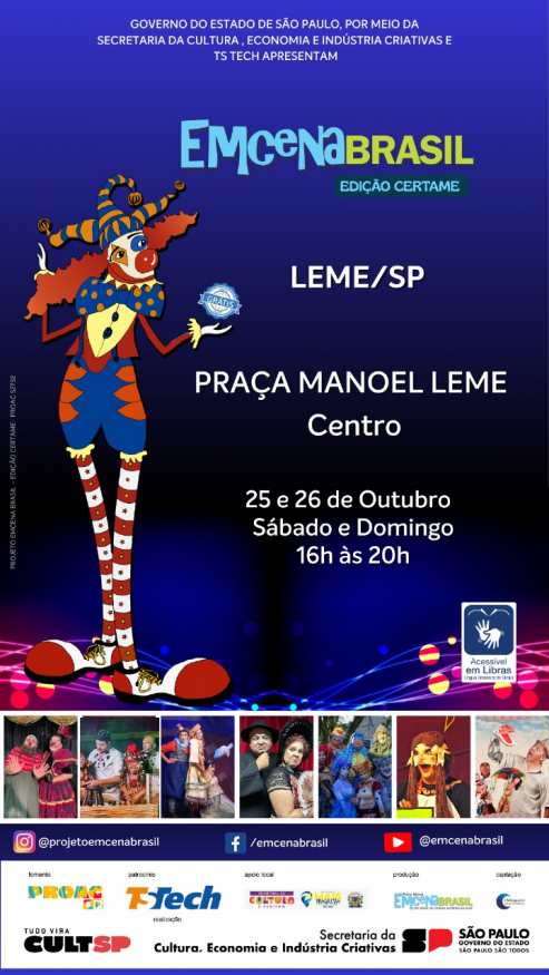 A Prefeitura Municipal de Leme, por meio da Secretaria de Cultura e Turismo, em parceria com a TS Tech do Brasil, recebe nos dias 25 e 26 de outubro (sábado e domingo) o projeto Palco Móvel Emcena Brasil – Edição Certame, que será realizado na Praça Manoel Leme (antiga FEPASA), das 16h às 20h, com entrada gratuita e classificação livre.