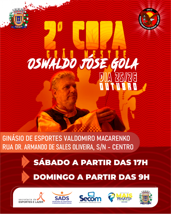 A Prefeitura do Município de Leme, por meio da Secretaria de Esportes, em parceria com a Associação Ribeiro de Artes Marciais (ARAM), Secretaria de Assistência e Desenvolvimento Social e Secretaria de Comunicação, realiza nos dias 25 e 26 de outubro a 2ª Copa Grão Mestre Oswaldo José Gola de Li Tchuó Pa Kung Fu, evento que homenageia o criador do estilo e demonstram o compromisso da cidade com a inclusão esportiva.