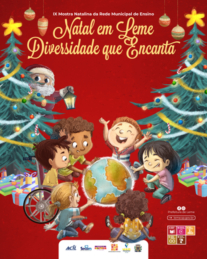 A IX Mostra Natalina da Rede Municipal de Ensino, “Natal em Leme: Diversidade que Encanta”, traz como proposta a valorização e o respeito à diversidade. Em parceria com a Educação e, tendo como cenário o Natal, que é um dos eventos mais familiares do Brasil e do mundo, o Papai Noel, como símbolo, vem trazer uma reflexão sobre o respeito às diferenças culturais, étnicas, raciais, entre outros.