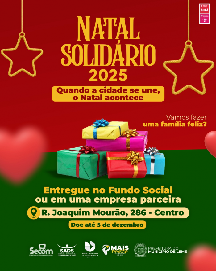 A Prefeitura do Município de Leme, por meio da Secretaria de Assistência e Desenvolvimento Social, em parceria com o Fundo Municipal de Solidariedade, informa o lançamento da Campanha Natal Solidário 2025.
