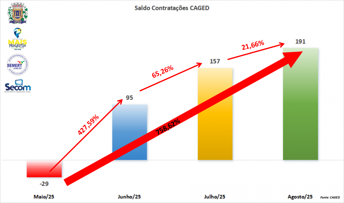 A Prefeitura do Município de Leme, através da Secretaria de Emprego e Relações do Trabalho, apresenta os resultados do CAGED de maio a agosto de 2025.