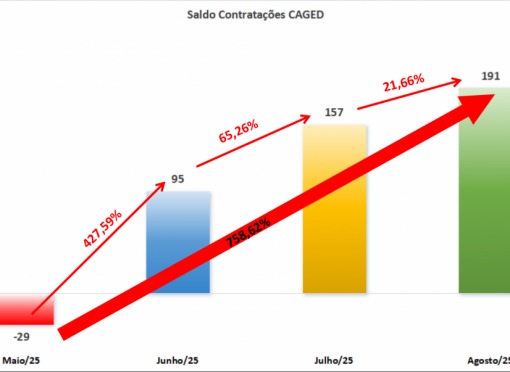 Em maio de 2025, houve mais demissões do que contratações, ficando a cidade com um saldo negativo de 29 demissões a mais do que contratações. De junho a agosto, o saldo apresentou significativa melhora, registrando um aumento de 758,62% em relação a maio de 2025. Confira a evolução abaixo: