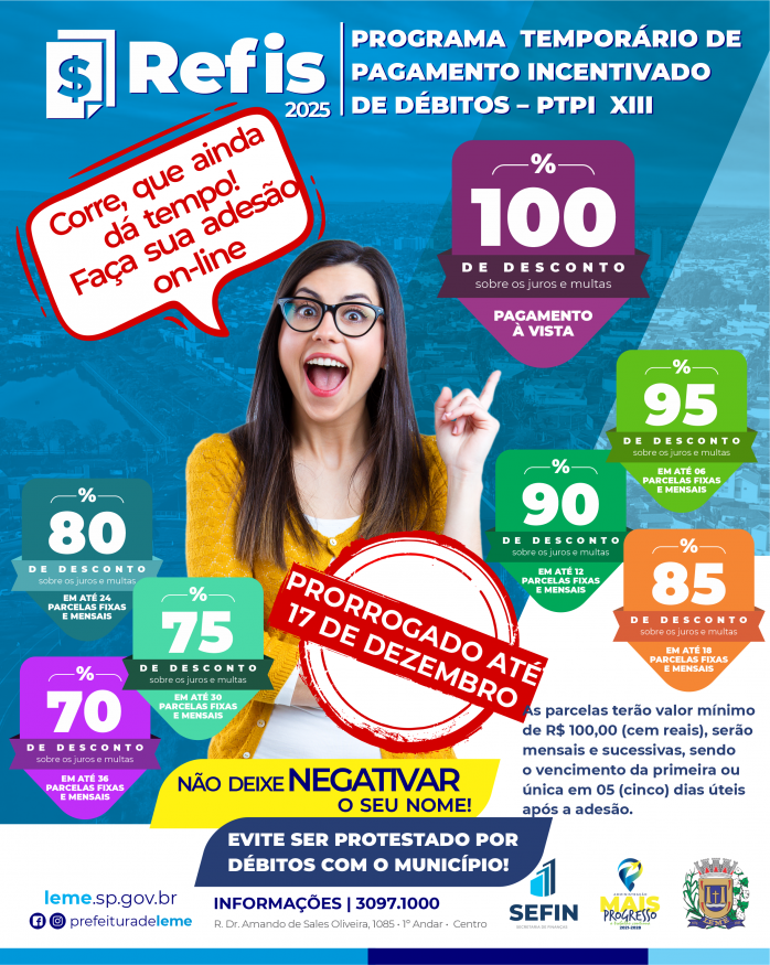A Prefeitura do Município de Leme, por meio da Secretaria de Finanças, informa aos cidadãos interessados em quitar suas dívidas com a Prefeitura, que o “Programa Temporário de Pagamento Incentivado de Débitos – PTPI XIII”, instituído pela LEI ORDINÁRIA Nº4441, de 13 de agosto de 2025,foi prorrogado até o dia 17 de dezembro de 2025.