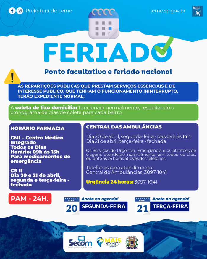 A Prefeitura do Município de Leme, por meio da Secretaria de Comunicação Social, informa sobre o ponto facultativo e feriado nacional nos próximos dias 20 e 21 de abril..