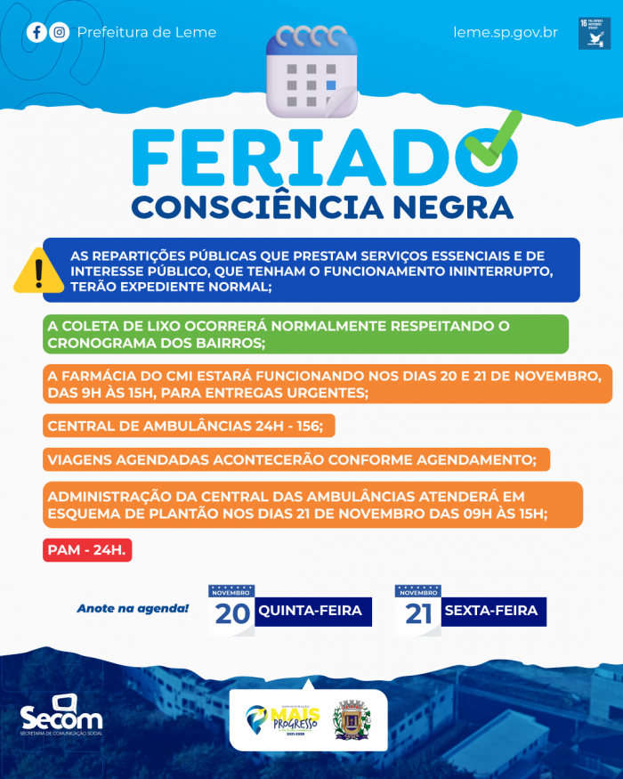 A Prefeitura do Município de Leme, por meio da Secretaria de Comunicação Social, informa sobre o ponto facultativo no próximo dia 21 de novembro, sexta-feira.