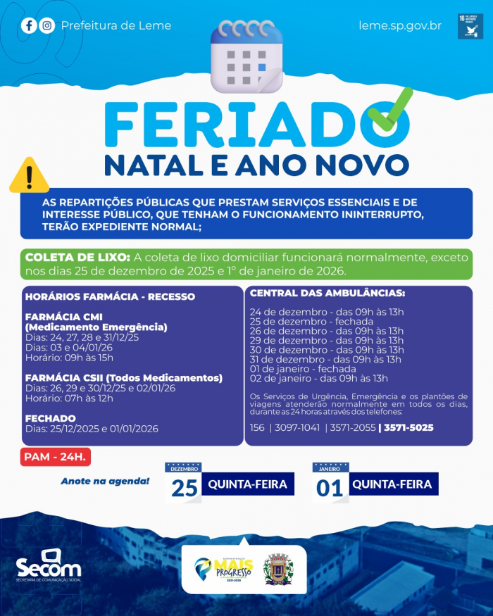 A Prefeitura do Município de Leme, por meio da Secretaria de Comunicação Social, informa sobre os pontos facultativos das repartições públicas municipais nos dias 24, 26, 29, 30 e 31 de dezembro de 2025 e 02 de janeiro de 2026.