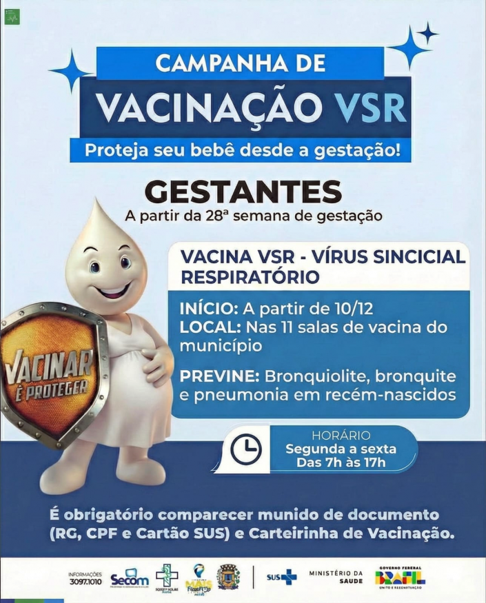 Vacinação de gestantes contra o VSR a partir de 10 de dezembro, em todas as salas de vacina, das 07h às 17h