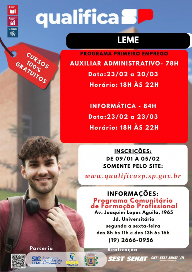 A Prefeitura do Município de Leme, por meio da Secretaria de Indústria e Comércio, em parceria com o Programa Qualifica SP e o SEST SENAT, está com inscrições abertas para cursos gratuitos de qualificação profissional nas áreas de Auxiliar Administrativo e Informática, voltados a jovens de 16 a 24 anos, alfabetizados.