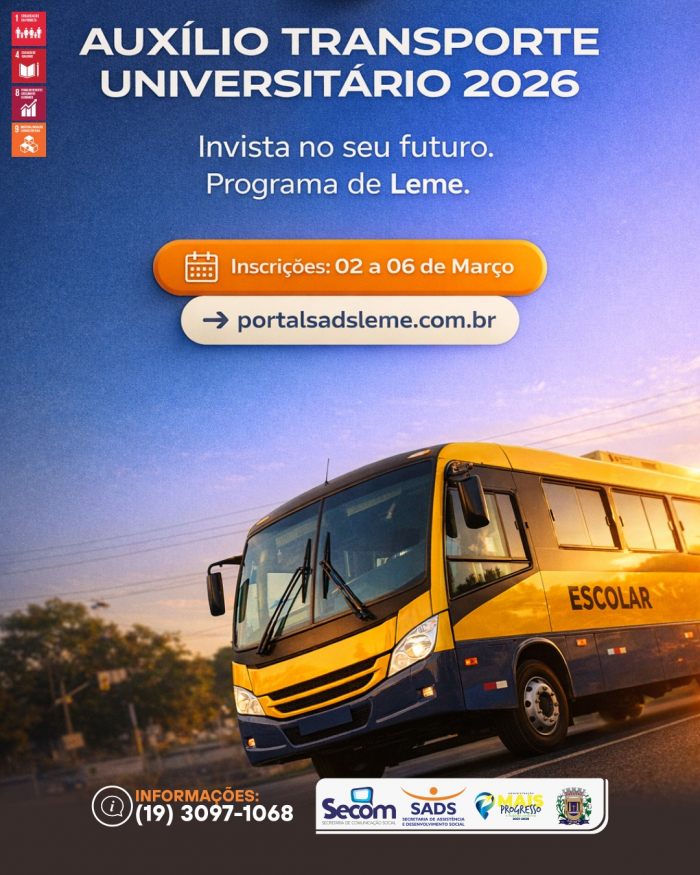As inscrições para requerimento do Auxílio Transporte para o exercício de 2026, ocorrerão dos dias 02 a 06 de março de 2026 e deverão ser realizadas através do site www.portalsadsleme.com.br.