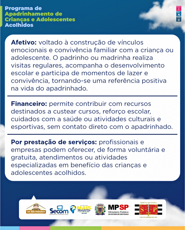 A Prefeitura do Município de Leme, por meio da Secretaria de Comunicação Social e da Casa do Menor Francisco de Assis, apoia a implantação do Programa de Apadrinhamento de Crianças e Adolescentes Acolhidos, instituído pela Vara da Infância e Juventude e pelo Ministério Público da Comarca de Leme.