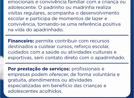 - Financeiro: permite contribuir com recursos destinados a custear cursos, reforço escolar, cuidados com a saúde ou atividades culturais e esportivas, sem contato direto com o apadrinhado.