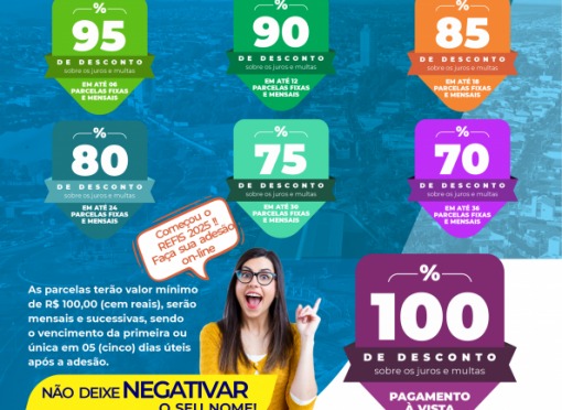 O programa, oferece descontos de até 100% sobre juros e multas para pagamento em parcela única (à vista) ou pagamento parcelado nas seguintes opções: