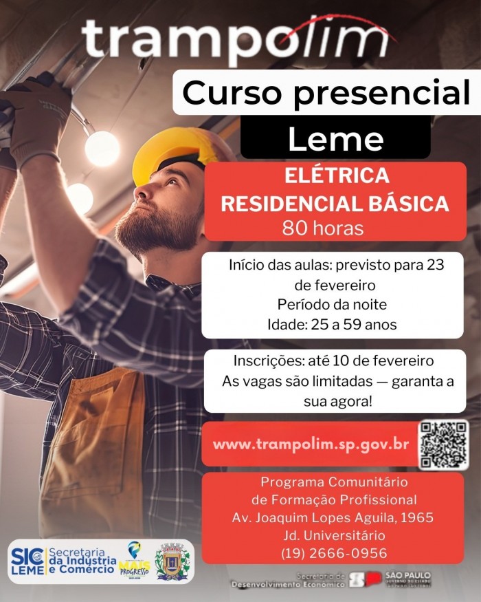 A Prefeitura do Município de Leme, por meio da Secretaria de Indústria e Comércio, informa que estão abertas as inscrições para o curso gratuito presencial de Elétrica Residencial Básica, oferecido pelo Programa Qualifica SP, com foco na qualificação profissional da população.