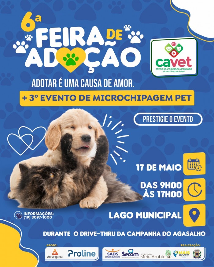 A Prefeitura do Município de Leme, por meio da Secretaria do Meio Ambiente, informa sobre a 6ª Feira de Adoção Responsável de cães e gatos e também Microchipagem pet.