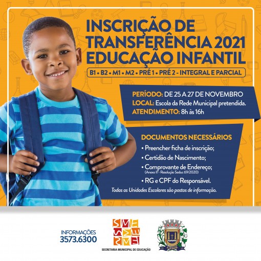 A Prefeitura do Município de Leme, através da Secretaria Municipal de Educação informa a toda população sobre as inscrições para as Transferências da Educação Infantil - Creche e Pré-Escola - que abrange Berçário 1, Berçário 2, Maternal 1, Maternal 2, Pré 1 e Pré 2 (Parcial e Integral) para o ano letivo de 2021: